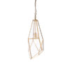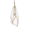An angular cage pendant made from glass panels with an antique brass effect trim. Compatible with LED lamps and dimmable.