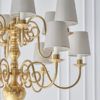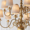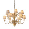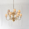 The Chamberlain 12 light pendant is an impressive, solid brass chandelier with a soft, mellow brass finish and beautifully curved detailing. Made to the highest quality using traditional casting techniques and then hand finished. Cream candle drips and marble silk shades compete the look.