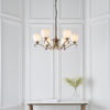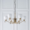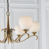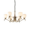 Exclusive 6 light pendant hung from a decorative chain and finished in antique brass, complemented by beautiful matt opal glass shades. Matching items available and compatible with LED lamps