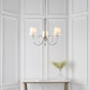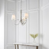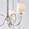 A stunning 3 light pendant incorporating beautifully curved arms adorned with crystal glass detailing and finished in a polished nickel plate, further complemented by vintage white silk shades. Compatible with LED lamps and dimmable