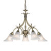 The Hardwick 5 light pendant is finished in antique brass effect with frosted glass shades. This fitting has an adjustable drop and can also convert to a flush fitting. Dimmable and suitable for use with LED lamps. Matching items and other finish also available
