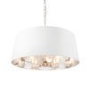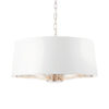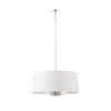 The Harvey 3 light pendant is finished in bright nickel plate and complemented by a vintage white, faux silk shade with metallic silver inner, for the perfect sophisticated boutique hotel look. Matching items also available.