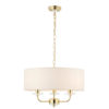 The Nixon 3-light ceiling pendant is finished in a brass effect plate. The 3 arms are complemented with a touch of crystal and the fitting is topped with a narrow, vintage white, faux silk shade. Height is adjustable, and the fitting is dimmable and suitable for use with LED lamps. Matching items and alternative finish available