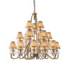 A 21 light pendant from the Oksana antique brass range. Features faceted lead crystal droplets and beige pleated shades with an antique brass trim. Matching items available and compatible with LED lamps