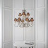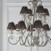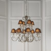 A 12 light pendant from the Oksana nickel range. Features faceted lead crystal droplets and chocolate pleated shades with a polished nickel trim. Matching items available and compatible with LED lamps