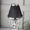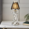 A small table lamp from the Oksana nickel range. Features faceted lead crystal droplets, a decorative stem base and a black pleated shade with a polished nickel trim. Matching items available and compatible with LED lamps