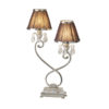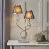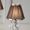A twin table lamp from the Oksana nickel range. Features faceted lead crystal droplets, a decorative double armed stem base and chocolate brown pleated shades with a polished nickel trim. Matching items available and compatible with LED lamps