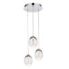 A glitzy multi pendant light with clear and chrome plated domed glass shades, each containing clear glass details that diffuse the light, a modern decorative design, perfect for today’s modern interiors. Finished in chrome plating, suspended from height adjustable clear flex, with integrated LED light source.