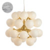 A timeless and modern design with a ‘mid-century’ feel, this impressive pendant light is at home in modern or classic interiors. Finished in an ‘on-trend’ brushed brass with gloss white glass shades and suspended from height adjustable thin wire cable with clear flex.