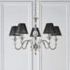 The Polina Nickel 5-light pendant is an elegant addition to any room. Finished in a polished nickel plate and adorned with k9 crystal glass detailing and black organza effect shades to give it an opulent feel