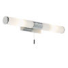 A 2 lamp wall light in polished chrome with a mirrored bracket and opal glass shades. The fitting is IP44 rated so is suitable for placement in a bathroom or over mirrors and pictures. Supplied with pull cord switch