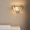 The Russell wall light has a traditional style and combines frosted glass and a solid brass trim. Dimmable and compatible with LED lamps