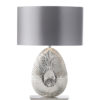 The nickel plate finish of this detailed table lamp has decorative lines growing out from the centre of the oval base, that sits upon a rectangle plate and under a grey satin oval shade. Suitable for use with LED lamps and supplied with inline switch
