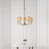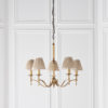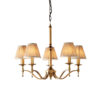The elegant 5 light pendant from the Stanford antique brass range has beautifully curved arms and simple clean detailing. Its complemented by pretty, beige organza effect shades. Matching items available