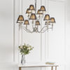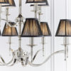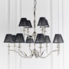 The elegant 12 light pendant from the Stanford nickel range has beautifully curved arms and simple clean detailing. Its complemented by pretty, black organza effect shades. Matching items available
