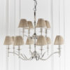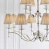 The elegant 12 light pendant from the Stanford nickel range has beautifully curved arms and simple clean detailing. Its complemented by pretty, beige organza effect shades. Matching items available