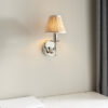 This elegant wall light from the Stanford nickel range has a beautifully curved arm and simple clean detailing. Its complemented by a pretty, beige organza effect shade. Matching items available