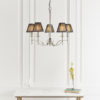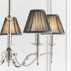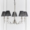 The elegant 5 light pendant from the Stanford nickel range has beautifully curved arms and simple clean detailing. Its complemented by pretty, black organza effect shades. Matching items available