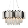 An impressive mix of polished nickel metal and high quality prism shaped clear glass crystals. This grand pendant will add finesse to any interior. Suspended from height adjustable cables and clear flex, create a statement by pairing with LED lamps.