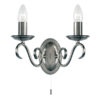 A twin wall light with scrolled arms in antique silver effect finish with pull switch. suitable for use with LED lamps and dimmable. Matching items available and also comes in an antique brass finish
