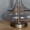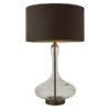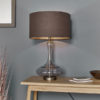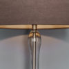 A modern classic grey tinted glass table lamp with aged pewter plated details finished complete with a dark charcoal faux linen shade