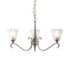 Exclusive 3 light pendant hung from a decorative chain and finished in polished nickel, complemented by beautiful art deco style glass shades. Matching items available and compatible with LED lamps
