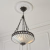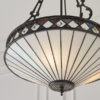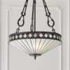 This Tiffany style inverted pendant is a beautifully understated design comprising of clean lines with a diamond shaped border. Teamed with a bronze effect fitting, dimmable and compatible with LED lamps. Matching items available for a coordinated look