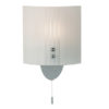 Glass and chrome finish wall light with pull cord switch. The frosted glass diffuser has a clear glass stripe.. Both dimmable and suitable for use with LED lamps