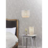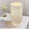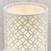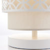 A beautiful chalk white and light grey table lamp in a layered 2-tier design with an intricate laser-cut outer shade creating a soft diffused light effect.