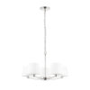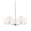 The Harvey 5 light pendant is finished in bright nickel plate and complemented by vintage white, faux silk shades each with metallic silver inner, for the perfect sophisticated boutique hotel look. Matching items also available.