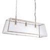 Inspired by box lanterns, the Hurst 3 light ceiling pendant is the perfect complement for today’s relaxed classic interiors. Suspend over beautiful dining tables to achieve a timeless classic look. Finished in bright nickel and suspended from height adjustable chains with black fabric flex. Pair with vintage style filament LED lamps that are perfectly framed by the subtle tapered metalwork and large clear glass panels.