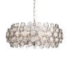 Adorned by beautiful ornate, hand made clear glass medallions, the Marella 6 light pendant is a stunning centre piece to hang in your bedroom, suspend over a dining table or position in your most loved interior. Perfect for use with filament LED lamps, finished in bright nickel and suspended from height adjustable wire with clear flex.