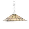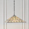 A striking large pendant featuring the strong lines associated with the art deco period, in clear and cream Tiffany style glass with green highlights. Dimmable and compatible with LED lamps