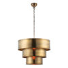 An eye catching pendant formed from 3 cylindrical tiered shades, all hanging from a metal chain and finished in an aged brass plate. Compatible with LED lamps and dimmable