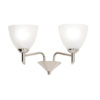 This 2 light wall fitting comes in a satin nickel finish complete with alabaster glass shades. Dimmable and suitable for use with LED lamps. Matching items available and also comes in an antique brass finish