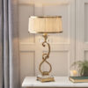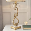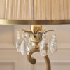 A small table lamp from the Oksana antique brass range. Features faceted lead crystal droplets, a decorative stem base and a beige pleated shade with an antique brass trim. Matching items available and compatible with LED lamps