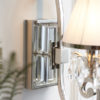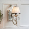A single wall light from the Oksana nickel range. Features faceted lead crystal droplets, a decorative arm and a white pleated shade with a polished nickel trim. Matching items available and compatible with LED lamps