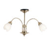 A 3 light semi flush ceiling fitting with frosted glass flower shaped shades and an antique brass effect finish. Matching pieces available