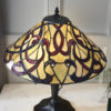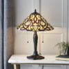 A classic Art Nouveau Tiffany style table light in vibrant shades of red and cream glass, complemented by a traditional dark bronze effect fitting. Compatible with LED lamps