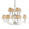 The elegant 12 light pendant from the Stanford nickel range has beautifully curved arms and simple clean detailing. Its complemented by pretty, beige organza effect shades. Matching items available
