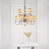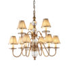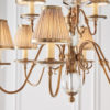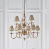 The 9 light Tilburg antique brass pendant is a classic design based on the Flemish chandelier but modernised with crystal spheres, glass bobeches and pretty beige shades. Dimmable and compatible with LED lamps. Matching items available