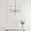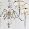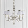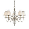 The 5 light Tilburg nickel is a classic design based on the Flemish chandelier, modernised with crystal spheres and glass bobeches. It comes teamed with beautiful white shades with a matching polished nickel trim. Matching items available